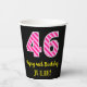 Ce joyeux autocollant carré à thème d'anniversaire comporte un grand numéro "46" avec un motif rose clair et rose foncé rayures, avec le message "Happy 46th Birthday," et un nom modifiable. L'arrière - plan est noir de couleur. Des tasses de papier sur le thème de l’anniversaire comme celle-ci pourraient être une façon amusante de célébrer le quarante-sixième anniversaire de quelqu’un. [~Z0000580]