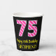 Ce joyeux autocollant carré à thème d'anniversaire comporte un grand numéro "75" avec un motif rose foncé et rose clair rayures, avec le message "Happy 75th Birthday,", et un nom personnalisé. L'arrière - plan est noir de couleur. Des tasses de papier comme celle-ci peuvent être utilisées à une fête d'anniversaire pour quelqu'un qui célèbre son 75e anniversaire. [~Z0000580]