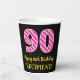 Ce motif joyeux d'autocollant carré à thème d'anniversaire comporte un grand nombre de "90" avec un motif rose foncé et rose clair rayures, avec le message "Happy 90th Birthday," et un nom modifiable. L'arrière - plan est noir de couleur. Des tasses de papier sur le thème de l’anniversaire comme celle-ci pourraient être une façon amusante de célébrer le 90e anniversaire de quelqu’un. [~Z0000580]