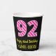 Ce joyeux autocollant carré à thème d'anniversaire comporte un grand numéro "92" avec un motif rose clair et rose foncé rayures, avec le message "Happy 92nd Birthday,", plus un nom personnalisable. L'arrière - plan est noir de couleur. Des tasses de papier comme celle-ci peuvent être utilisées pour célébrer le 92e anniversaire de quelqu’un. [~Z0000580]