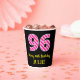 Ce motif joyeux d'autocollant carré à thème d'anniversaire comporte un grand numéro "96" avec un motif rose foncé et rose clair rayures, avec le message "Happy 96th Birthday,", et un nom personnalisé. L'arrière - plan est noir de couleur. De jolies tasses en papier comme celle-ci pourraient être utilisées pour organiser une fête pour quelqu'un en l'honneur de son 96e anniversaire. [~Z0000580]