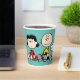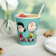 Regardez Lucy, Charlie Brown, Snoopy, Sally, et Linus assis ensemble dans une rangée.