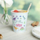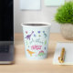 Ce joli modèle de tasse en papier de 3ème anniversaire avec des dessins animés de dinosaures de jungle bleu pastel, avec un t-rex, stegosaurus, arcs-en-ciel et des plantes jurassiques de jungle, et peut être personnalisé avec un nom et un âge. L'ajout parfait sur le thème du dinosaure à l'anniversaire de votre enfant.