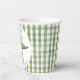 Boys Green Stomp Chomp Roar Dinosaur 1er anniversaire Papier Plate Party comme une tasse de papier d'anniversaire à thème dinosaure avec un grand dino, ballons, casquette de fête, et un texte bleu. Cette tasse de papier d'anniversaire à thème dino dispose également d'un motif vert plaid et peut être utilisé pour n'importe quel âge.