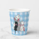 Ces tasses en papier sont des motifs plaid bleu et blanc avec une chatte mère blanche heureuse assise avec ses trois petits chatons noirs, gris et blancs, tous portant des arcs roses sur le cou.