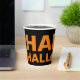 Pour ceux qui n'aiment pas beaucoup d'histoires ou de foulures cette tasse en papier dispose d'un design simple avec le type. Cette tasse à thème d'Halloween est ornée d'un arrière - plan noir basique. En orange, les mots "HAPPY HALLOWEEN" enveloppent la tasse. Il y a une image d'un citrouille à la place du "o", dans le mot "HALLOWEEN".