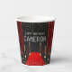 Ces tasses de fête personnalisées sont décorées dans un style élégant et glamour VIP Hollywood. Une image du tristement célèbre tapis rouge est placée au centre. Un exemple d'événement et de nom sont imprimés entre de luxueux rideaux de théâtre rouge. Vous pouvez personnaliser les tasses pour y inclure votre nom et votre texte personnalisés. Des lumières scintillantes traversent la partie supérieure et des confettis de parties scintillant d'or bordent la partie inférieure.