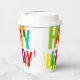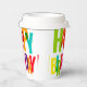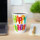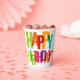 Une tasse en papier colorée ornée de lettres vibrantes qui épellent "Joyeux anniversaire" dans différentes teintes. La tasse est dressée contre un arrière - plan en marbre clair et propre, mettant l'accent sur son design festif. La typographie audacieuse crée une atmosphère ludique et joyeuse.