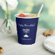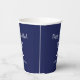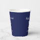 Happy Hanoukka Blue Holiday tasse en papier, avec une simple menorah blanche et la typographie de script. Avec des lettres personnalisables en blanc, vous pouvez ajouter vos propres informations. Une façon festive de célébrer avec des amis et des proches.