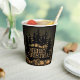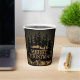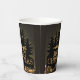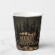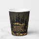 Une photo d'une silhouette noire d'une forêt d'épinettes avec des petites lumières scintillant ici et là sur les arbres. En face de la forêt, il y a une inscription en lettres d'or qui dit "Joyeux Noël". L'arrière - plan est sombre.
