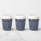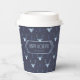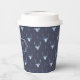 Cette tasse en papier présente un motif branché de silhouettes de tête de cerf avec des bois incurvés, des flèches stylisées et de minuscules flocons de neige dans les tons bleu ciel et ardoise sur un arrière - plan bleu marine. Un texte optionnel "Joyeux Fêtes" et un étiquette ont été fournis pour ajouter votre nom et/ou un autre texte. Faites une recherche ID861 à ID864 pour voir d'autres options de couleurs et d'autres produits dans cet ensemble moderne de design de Noël.