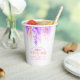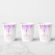 Coupes en papier mariage de peinture à l'aquarelle de type vigne loose. Belle aquarelle abstraite florale lâche design idéal pour des événements mariages ou d'anniversaire dans de jolies nuances de violet et de corail orange sur une tasse blanche. © Original watercolor art and design par Sarah Trett www.sarahtrett.com pour www.mylittleedenweddings.com