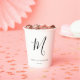 Cette tasse en papier mariage présente un design simple mais élégant.  Un monogramme de style manuscrit noir, du texte propre pour les noms de la mariée et du marié et leur date de mariage apparaissent sur un arrière - plan blanc.