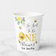 Floral Honey Bee First Bee day Birthday Paper Cups Sweet bumble ou miel bee thème de fête de premier anniversaire tasse de papier pour une petite fille avec des arrangements floraux principalement jaunes et quatre mignonettes abeilles. Idéal pour une fête de premier anniversaire sur le thème des abeilles.