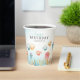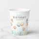Des tasses de papier de fête à thème océanique avec de l'aquarelle de poissons tropicaux, des étoiles de mer, des méduses et des plantes de la mer, le dicton "anniversaire heureux", et le nom des enfants.