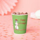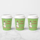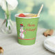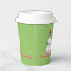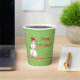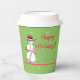 Des tasses en papier de vacances à l'air festif avec ma conception d'un bonhomme de neige souriant portant des lunettes de soleil et portant un sucre de canne sur un arrière - plan vert.