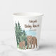 Ce design de tasse en papier baby shower neutre présente de beaux ours de famille et de bébé de style Hygge dans une scène de forêt boisée.