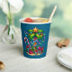 Tasses en papier avec une image de vacances saisonnière. Un palmier tropical orné de lumières festives surmonté d'une étoile. Un sucre de canne géant rouge et blanc qui sort du sable. Cadeaux de Noël sous l'arbre. Whimsical et amusant.