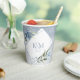 Une police de signature manuscrite associée à des cadres géométriques, des arrière - plans brillants et des fleurs luxuriantes sont utilisés dans cette collection pour donner un ton chaleureux et intime à votre mariage. La tasse en papier mariage montrée ici, avec ses flancs d'angle dans les tons bleu poussiéreux, fournit un modèle pour ajouter facilement vos propres initiales et date mariage. Recherchez ID889 pour voir tous les produits de ce jeu de mariages.