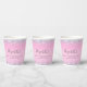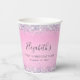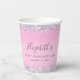 Jolie, glamour et douce fille 16 ans tasses de papier de fête avec holographe brillant violet, rose et argent faux parties scintillant confetti frise contre un arrière - plan rose et son nom dans un script gris doux tendance.