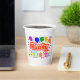 White 8 oz Paper Cup=optional, No Lid=optional with a Drawing/Design of the Word = Party, in the color Red and White, with some Colorful Balloons, Confetti, and Gift Packages, = (Drawing/Design by P. J.M.) = on the front and back of it