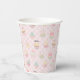 Complete your party table setting with these charming paper cups featuring a sweet dessert pattern. The cups display the full seamless tile graphic of cute bakery treats and whimsical frosting against a soft pastel pink gingham background with mint blue yellow accents. These adorable food illustration cups are perfect for custom party decor, ensuring your drinks are served with a festive touch of repeating sweethearts style at any celebration.