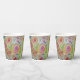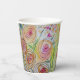 De grandes fleurs roses ornent cette tasse de papier avec de petits feuilles verts, ainsi que de minuscules coeurs roses, créés en aquarelle.