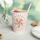 Ces gobelets en papier présentent un excellent début de design original avec un arrière - plan rayé rose et blanc où une couronne flottante de sigles de Noël autour d'un médaillon central d'un bonbon classique à la menthe poivrée de style pin. Il a une atmosphère rétro des années 1940-1950 en raison de nuances défraîchies de rouge et vert & effet "grungé".