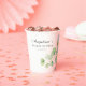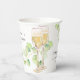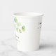 Gobelets en papier pour une baby shower dans un style doux, élégant et minimaliste, décorés de branches avec des feuilles vertes et des verres.