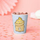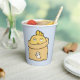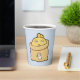 Un poulet jaune ennuyé assis dans un sac à fourrage. Stuck ? Oui. Préoccupé ? Pas vraiment.