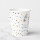 Premier voyage autour du Soleil 1er Anniversaire Papier Cup Espace ou premier voyage autour du Soleil première coupe de papier d'anniversaire avec un soleil, lune, étoiles, vaisseau spatial et astronaute dans une couleur orange et gris bleu.