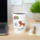 Design à thème d'anniversaire mignon avec l'illustration originale de Destei d'un manteau rouge couleur cheveux courts Dachshund race chien. A côté du chien il y a des ballons colorés d'anniversaire attachés sur un os de chien et une boîte cadeau de couleur violet et jaune. L'arrière - plan a un motif ludique de confettis pastel colorés sur un arrière - plan blanc. Vous trouverez également une zone de texte personnalisable.
