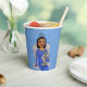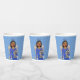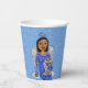 Ces tasses en papier ont un ange aux cheveux noirs portant une robe bleue avec des étoiles sur un nuage blanc tenant un chat ange blanc avec des halos en argent sur un arrière - plan bleu clair.
