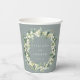 Elégantes tasses en papier personnalisées bleu-vert doux pour les célébrations mariages. Un design à double face, avec des neiges peintes à la main et des eucalyptus disposés en une belle couronne botanique. Tout le texte est entièrement modifiable de sorte que vous pouvez facilement modifier/supprimer le message sur un ou les deux côtés et modifier le style/la couleur/la taille de la police. Coordonner les éléments disponibles.