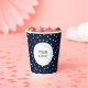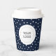 Cette tasse en papier minimale est munie d'un logo simple et d'un motif confetti brosse sur un arrière - plan bleu marine. Ajoutez votre logo et customisez le texte avec vos informations. Vous pouvez utiliser cette tasse personnalisée à votre lieu d'affaires, magasins, événement d'entreprise ou, etc.