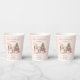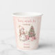 Cute Christmas Girl Baby shower tasses en papier avec un bonhomme de neige adorable, sapin de Noël avec des cadeaux et de la neige en rose vif avec des vibes vintages. Customiser facilement le texte - Kate Eden Art