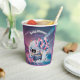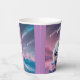 Une tasse en papier pour un baby shower à thème spatial décoré de ballons bleus et roses, adapté à tous les genres