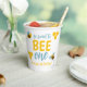 Coupes de papier de fête du 1er anniversaire mignonnes avec l'expression "So Sweet to Bee One" en lettrage bleu et jaune entouré d'illustrations d'abeilles volantes et de combs de miel. Personnalisez ces adorables tasses à papier de 1er anniversaire sur le thème de l'abeille avec le nom de votre enfant. Le dessin se répète à l'arrière de la tasse de papier.