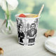 Il s'agit d'une tasse de café chaud avec couvercle avec un design fantaisiste.