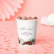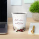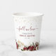Superbes tasses en papier de douche nuptiale d'automne, avec le titre "tomber amoureux" en script de calligraphie, de belles fleurs bordeaux et blanches avec feuillage botanique vert foncé et parties scintillant faux or, citrouilles d'aquarelle blanc et or et un élégant modèle qui est facile à customiser.