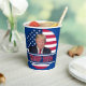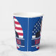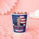Trump 2024 Tasses à papier Donald Trump avec le drapeau américain derrière lui, Trump 2024 décrit en blanc à travers le fond.