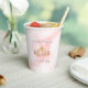 Le texte gris est sur une tasse en marbre rose. Côté 1 : La tasse dit "Une petite princesse est en route" et une fausse tiare d'or (pas de feuille) est au centre.