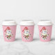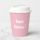 Quelques tasses de papier de Noël roses avec une vache caricaturée enchevêtrée dans ses lumières de Noël. Le texte à l'arrière dit "Joyeuses fêtes". Gardez-le tel quel ou modifiez-le avec votre propre nom. © ArianeC Illustrations-Tous droits réservés
