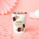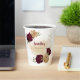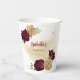Belle tasse en papier d'automne avec des fleurs bordeaux et beige or et des feuilles vertes .