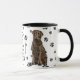 A chocolate brown Labrador Retriever Dog looks out at you from two sides of this mug. The text between the two images says "On the 8th day, God created the LABRADOR RETRIEVER and called it VERY GOOD". The dog images and the white oval banner containing the text fields are placed on a white background with black paw prints.