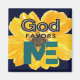 Beautiful graphic design, watercolor yellow flower backdrop with the words "GOD FAVORS ME" - all in a dark navy blue background.