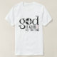 This white t-shirt features the word "God" in a stylized black script, with the "o" replaced by a black circle containing a white cross. Below, "IS GOOD" is in smaller black block letters, and "ALL THE TIME" is in a slightly larger black font. A small red heart is NEXT to the "G" of "GOOD", also forming a cross within it. This design expresses a common Christian affirmation.