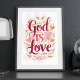 Enhance your space with this beautiful "God is Love" wall art inspired by 1 John 4:8. The design features a warm colour palette of pink and gold, with delicate hearts and foliage framing the inspiring message. Perfect for adding a touch of faith and elegance to any room, this piece is ideal for those seeking to reflect their beliefs in their home decor or to give as a meaningful gift.