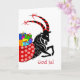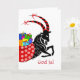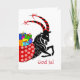 Custom front, add your text, to this Christmas greeting card written in Swedish. God Jul "Merry Christmas" on the cover can be changed by you if desired. Illustration of the Yule Goat, Julbocken, with horns wrapped in red ribbons and bows and carrying a gift bag on its back full of presents. Bold and colourful design in striking colours. Message inside written in Swedish = Merry Christmas and Happy New Year. Art, image, and verse copyright © Shoaff Ballanger Studios.