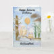 Soft and serene, this hand-painted watercolor captures a Snowy Owl resting on a winter branch beside a layered vanilla birthday cake topped with gentle purple frosting and glowing candles. Ivy-covered trees in the background add a quiet January charm, making this a sweet and thoughtful birthday scene created especially for a great goddaughter who loves birds, nature, and peaceful winter moments.